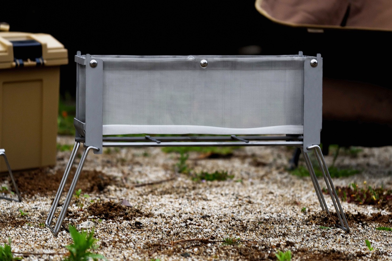 <材質> 本体・サイドバー・脚部:ステンレス(SUS304) / メッシュシート: ステンレス(SUS304) ※ハトメはアルミ製 / 巾着袋:綿 / ロゴステッカー:強光沢紙(耐水)